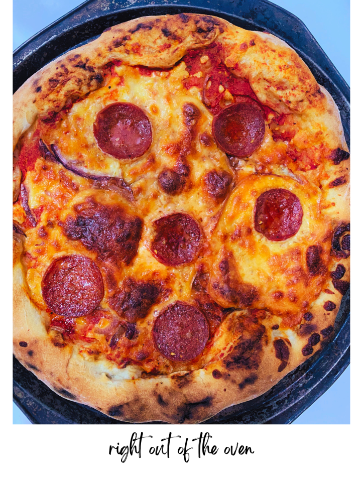 When the pizza was finished baking it looked scrumptious (*only takes 16 mins to bake), but it could’ve done with a little more salami (just saying).